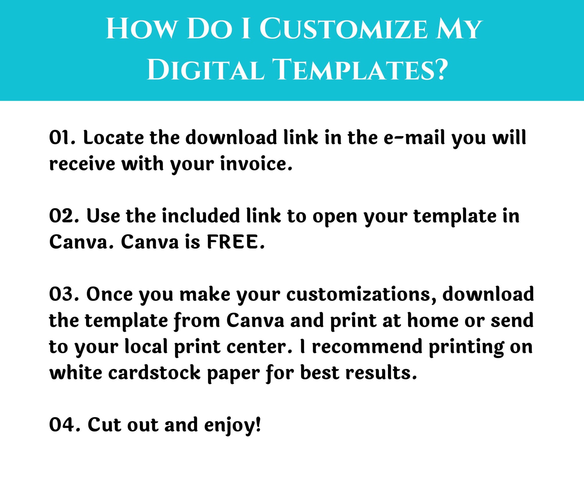 In Canva, all the text on our gift tags is customizable or you can just add your name, download the customized version and print them. There are 6 tags on 1 US Letter sized page. Each tag measures 3x3 inches.