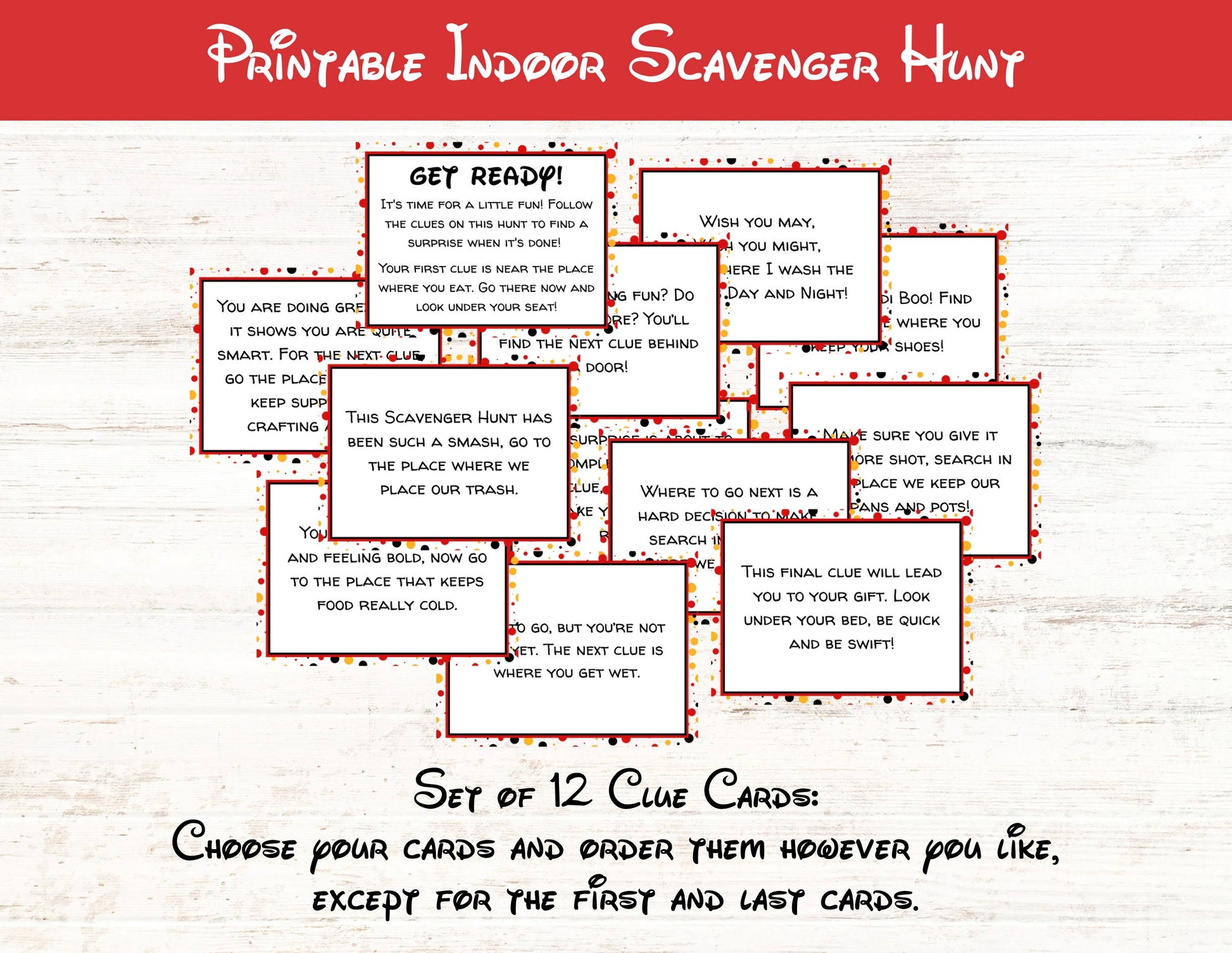 There are 3 sheets with 4 clues per page. Simply print the pages and cut out the clues. You can use all 12 clues or just pick your favorites. Clues can be placed in any order (except for the first and last clues), so you can make the hunt as long or short as you like!