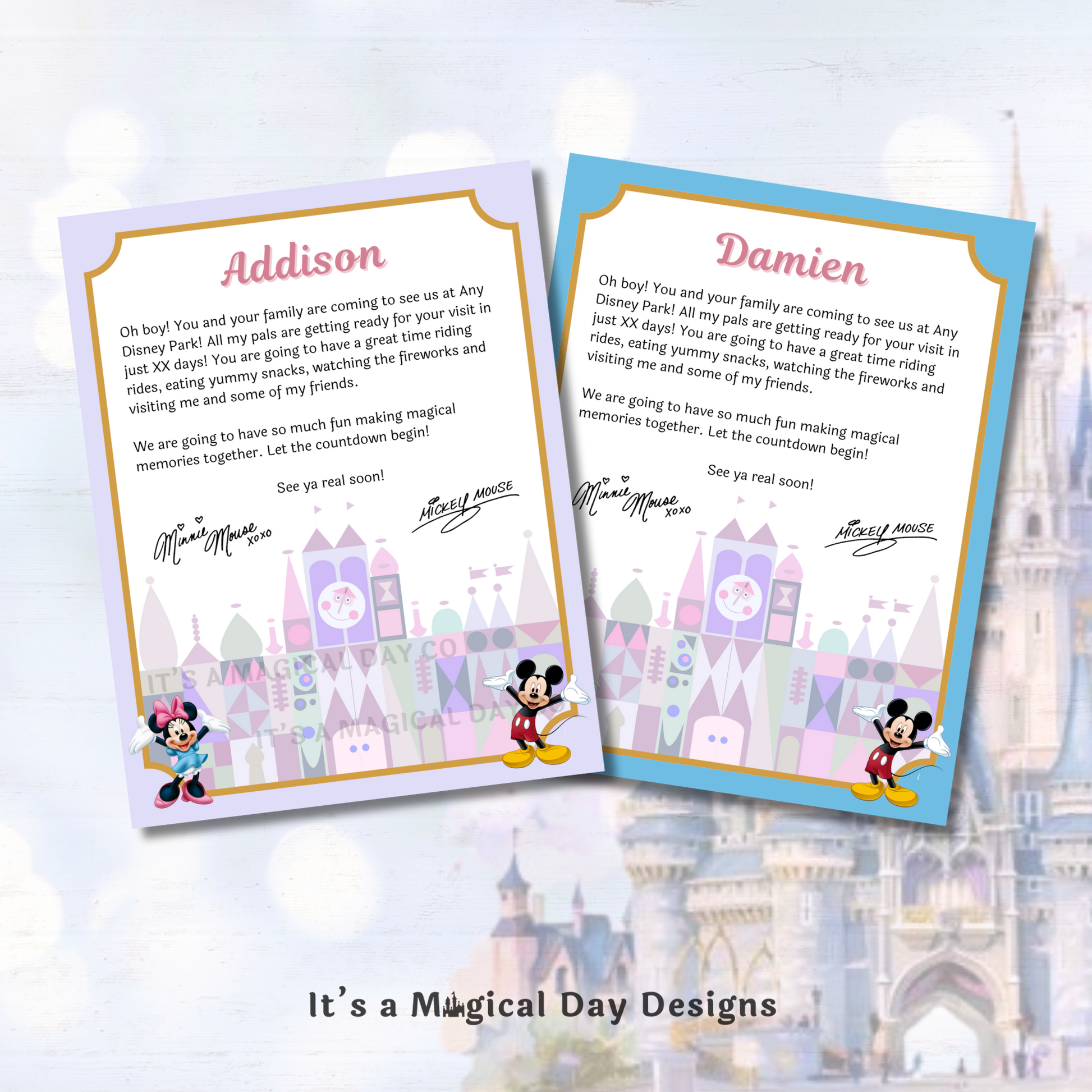 Are you revealing a surprise trip to the Happiest Place on Earth? Vacations are amazing experiences but can be hard to give as a "gift." With our customizable letters from Mickey and Minnie, you can give your family or friends a gift experience they will never forget! Make your trip reveal magical!