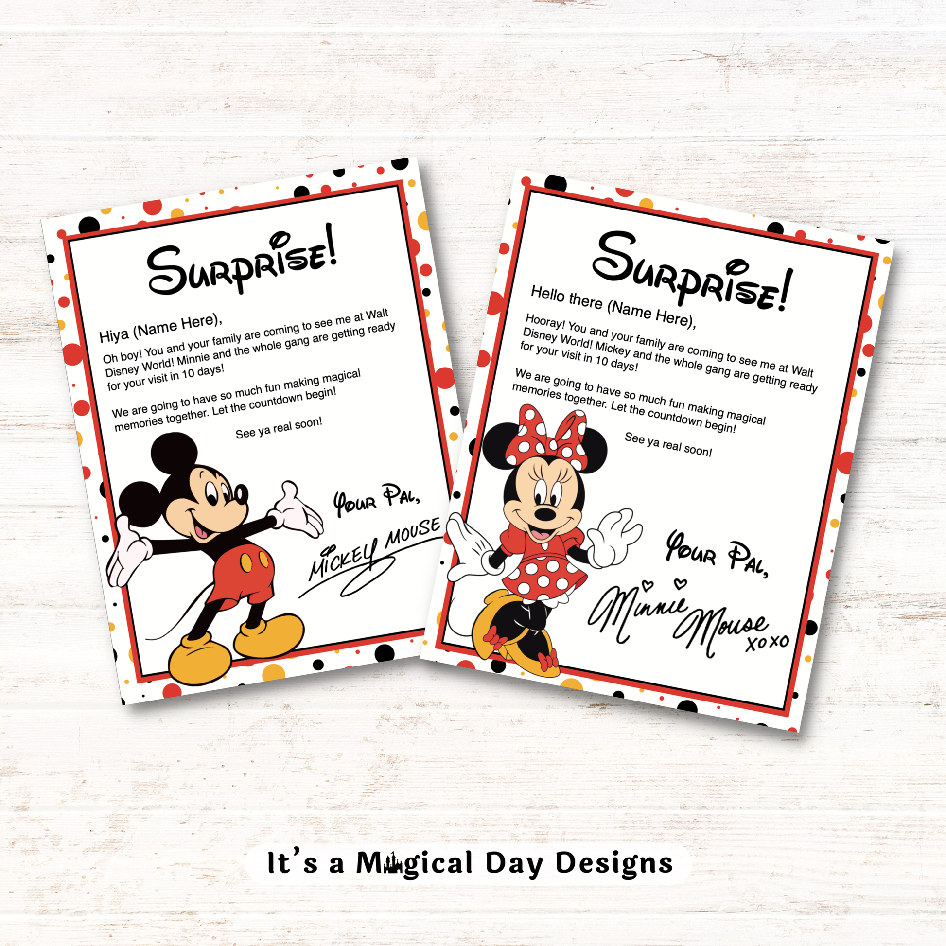 🌟 Are you revealing a surprise trip to Disney World in Florida? 🎁 Surprise the recipient with a customizable letter from Mickey or Minnie.